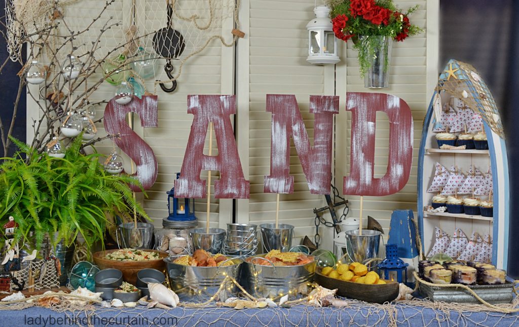 When it comes to hosting a summer gathering, a shrimp boil is already a showstopper—but why not take it up a notch and turn it into a full shrimp boil party table? This isn’t your ordinary buffet line. Instead, picture a spread that instantly transports your guests straight to the beach: seashells scattered across the table, rustic fisherman’s netting draped for that coastal vibe, and giant letters spelling out SAND as the centerpiece.