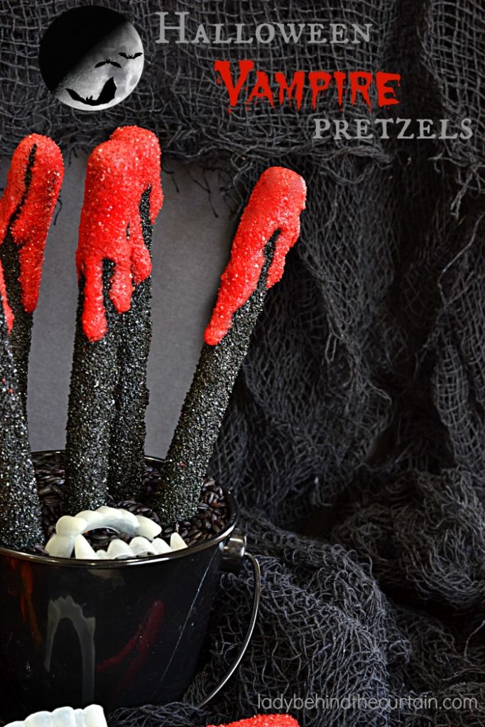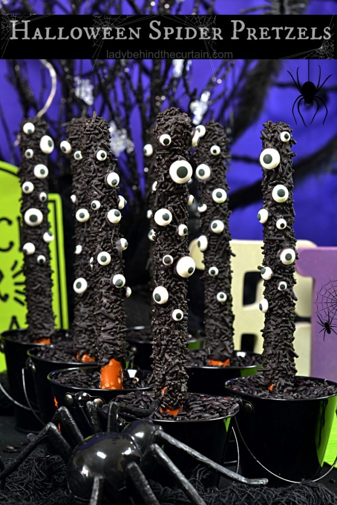 - Create a centerpiece! Fill containers (like jars or buckets) with the decorated pretzels and line them down the center of a table. Perfect for a kids Halloween party!